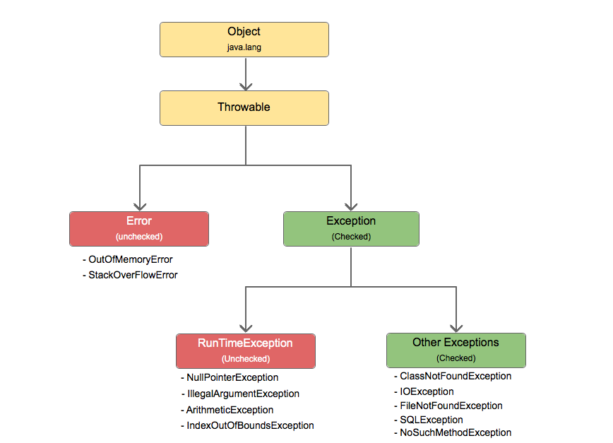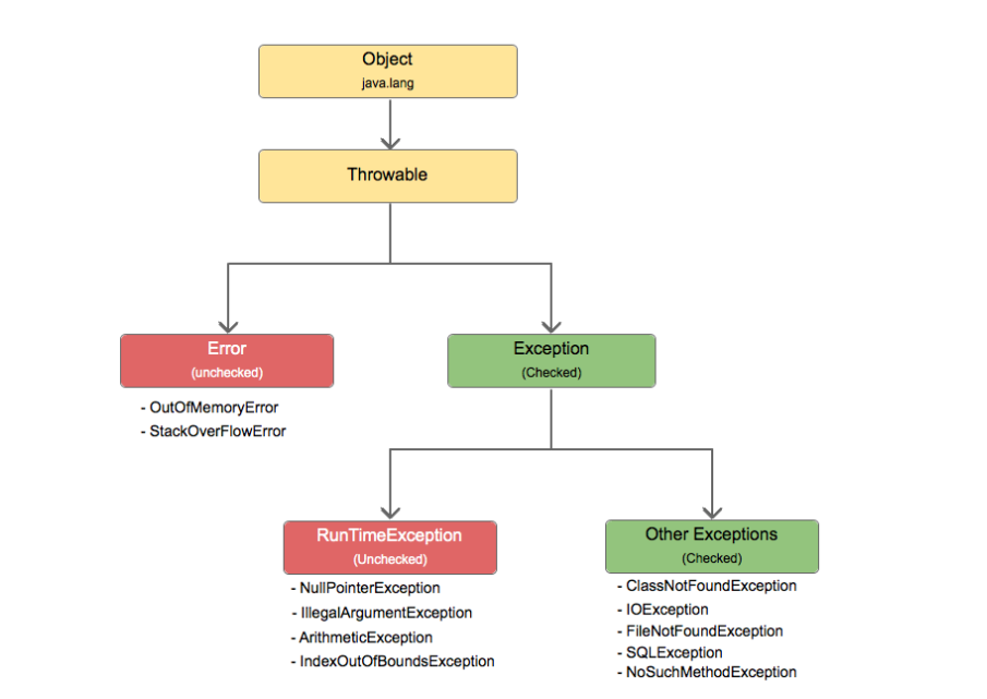 자바에서 다루는 모든 예외 오류는 Exception 클래스에서 처리한다. 그리고 위의 Exception 클래스 트리 구조를 보면 Unchecked와 Checked로 구분됨을 볼 수 있는데, 이것이 컴파일 에러와 런타임 에러를 따로 클래스로 구분했기 때문이다.