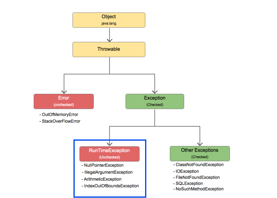즉, Exception 클래스는 다시 RuntimeException(런타임 에러를 다룸)과 그 외의 자식 클래스 그룹(위 그림에서 Other Exception, 컴파일 에러를 다룸)으로 나뉘게 된다.